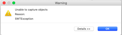 I am also getting same type of issue. It is taking more than 20 minutes to capture and at last it is throwing this message - “Unable to capture object. Reason : SWT Exception”…