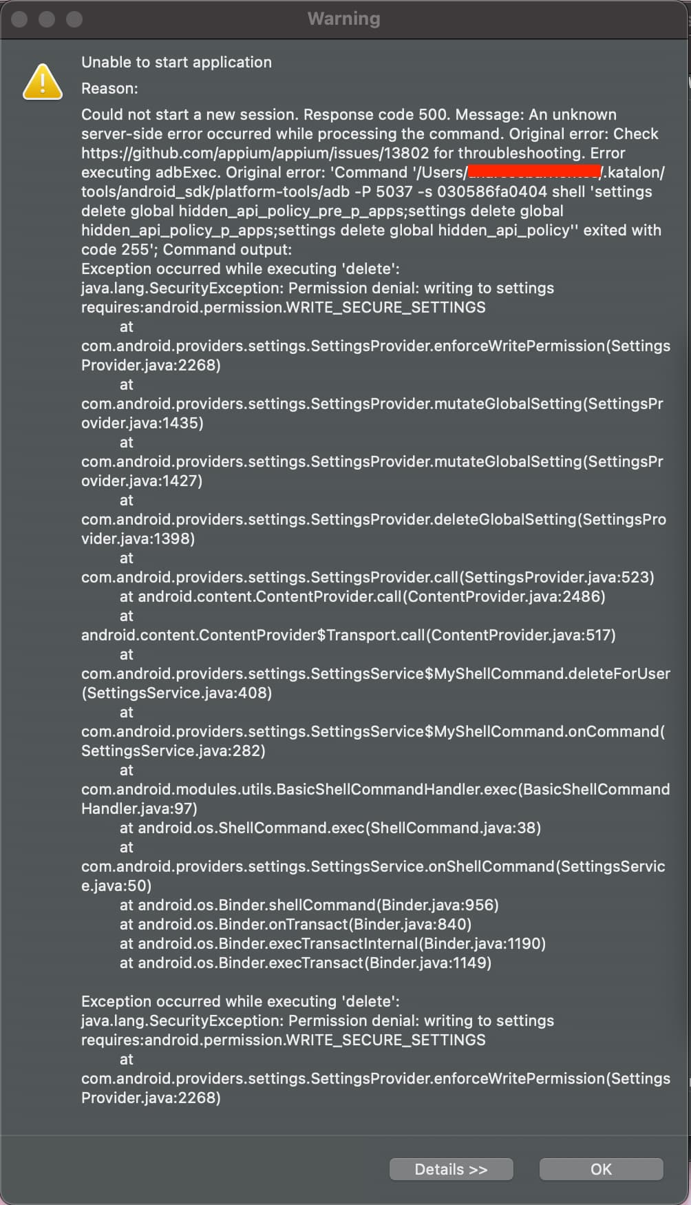 Hello, please help me, I cannot start the application, I’m using Katalon, but it’s showing a warning like this.